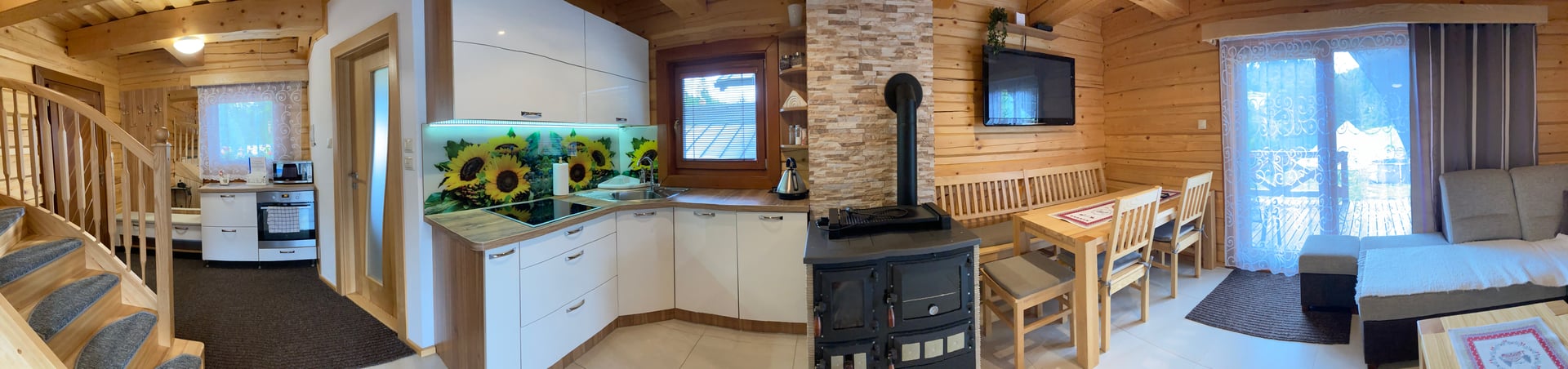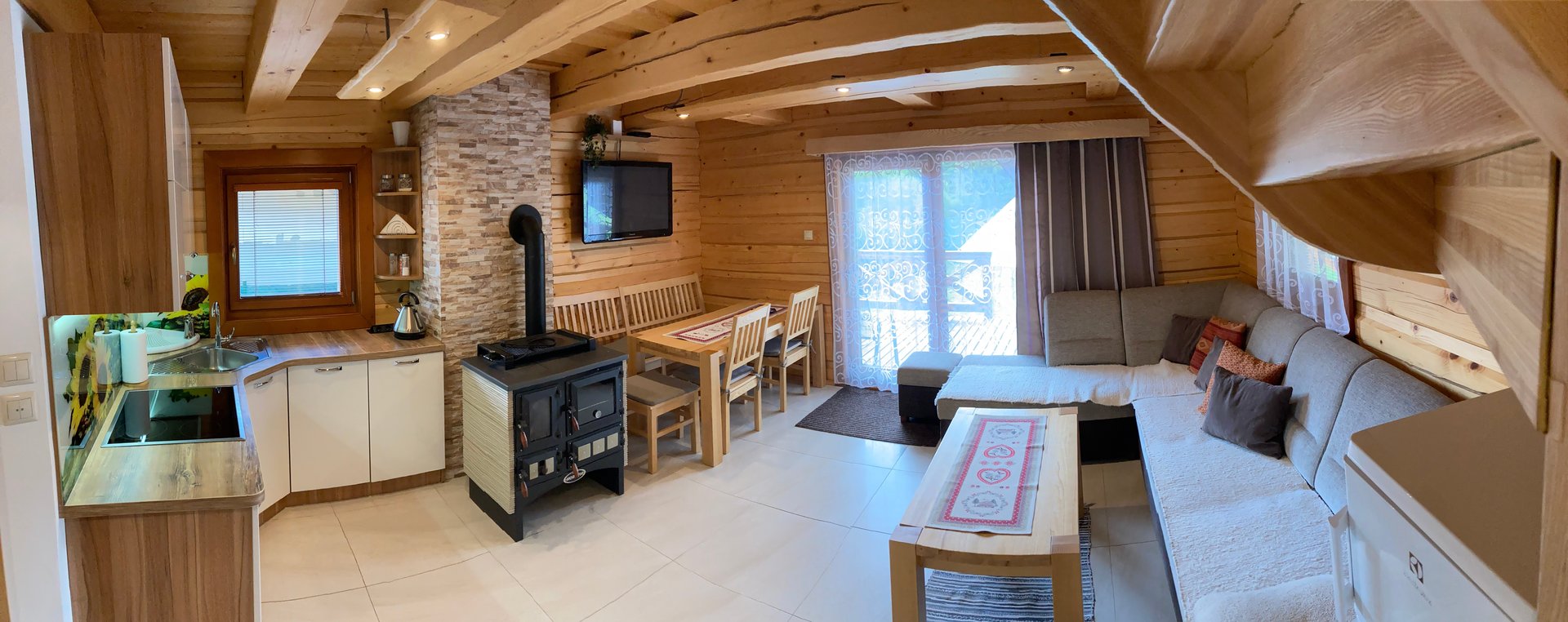 Prízemná časť chaty Vám poskytne dostatočný priestor na Váš voľný čas. Tu strávite dovolenkové chvíle v kruhu blízkych na gaučovom sedení, sledovaním dobrého programu v televízore so satelitným príjmom, počúvaním rádia alebo vychutnávaním si pokrmov za typickým dreveným stolom so stoličkami. V rámci tejto miestnosti sme pre Vás pripravili kompletne zariadený kuchynský kút s krbovou pieckou, sklokeramickou varnou doskou, elektrickou rúrou, mikrovlnnou rúrou, rýchlovarnou kanvicou, chladničkou s mrazničkou a navyše aj s umývačkou riadu.